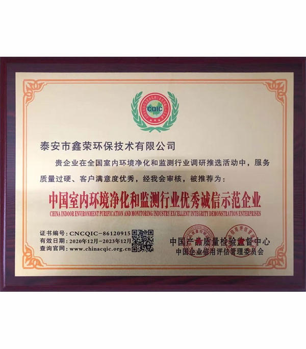 中国室内环境净化和监测行为优秀诚信示范企业